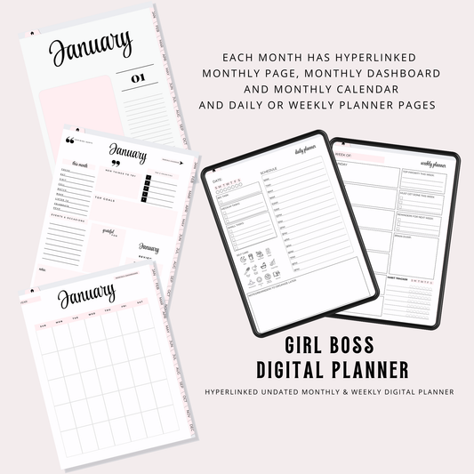 Girl Boss Digital Planner | Hyperlinked Undated PDF | Portrait Layout | Girl Boss Digital Organizer