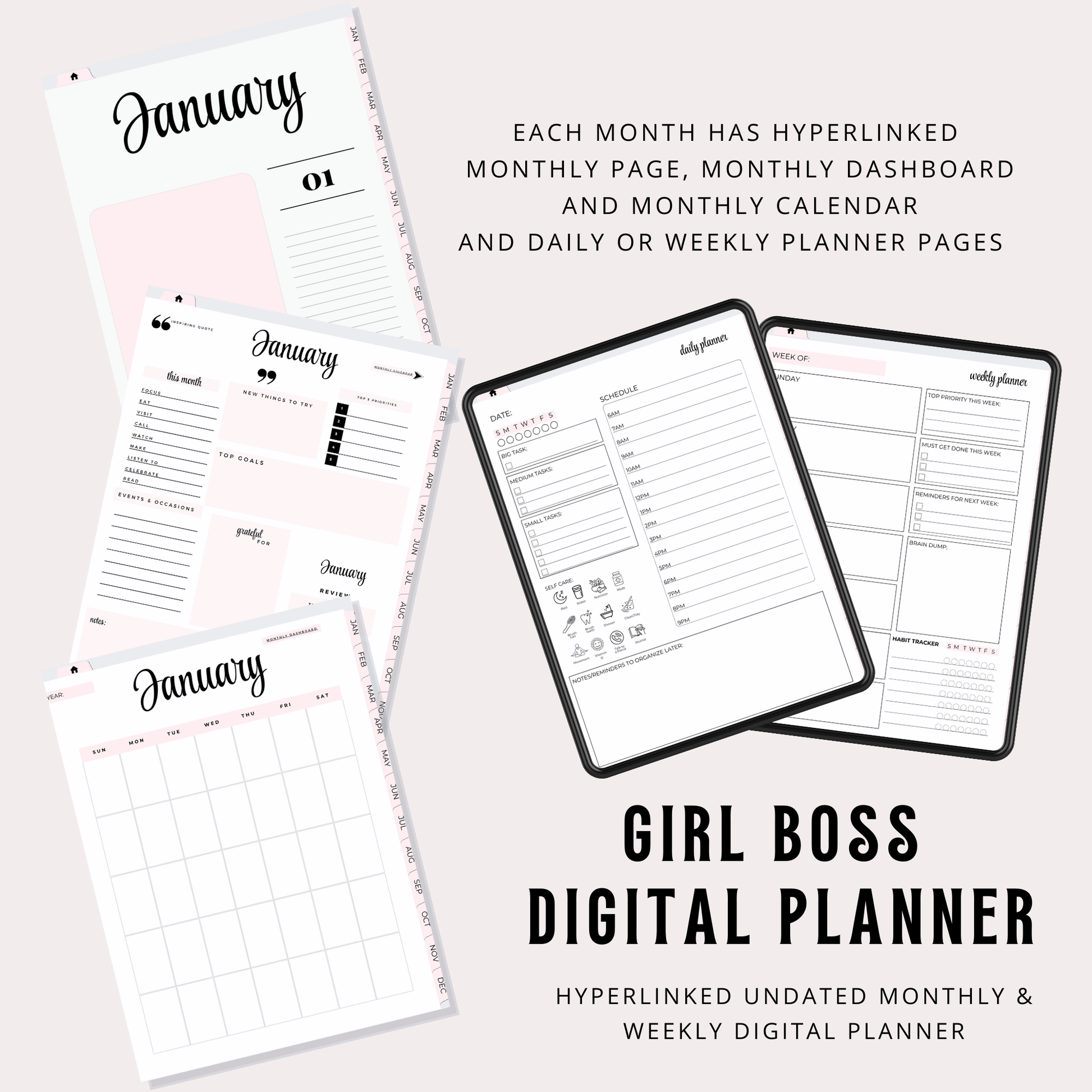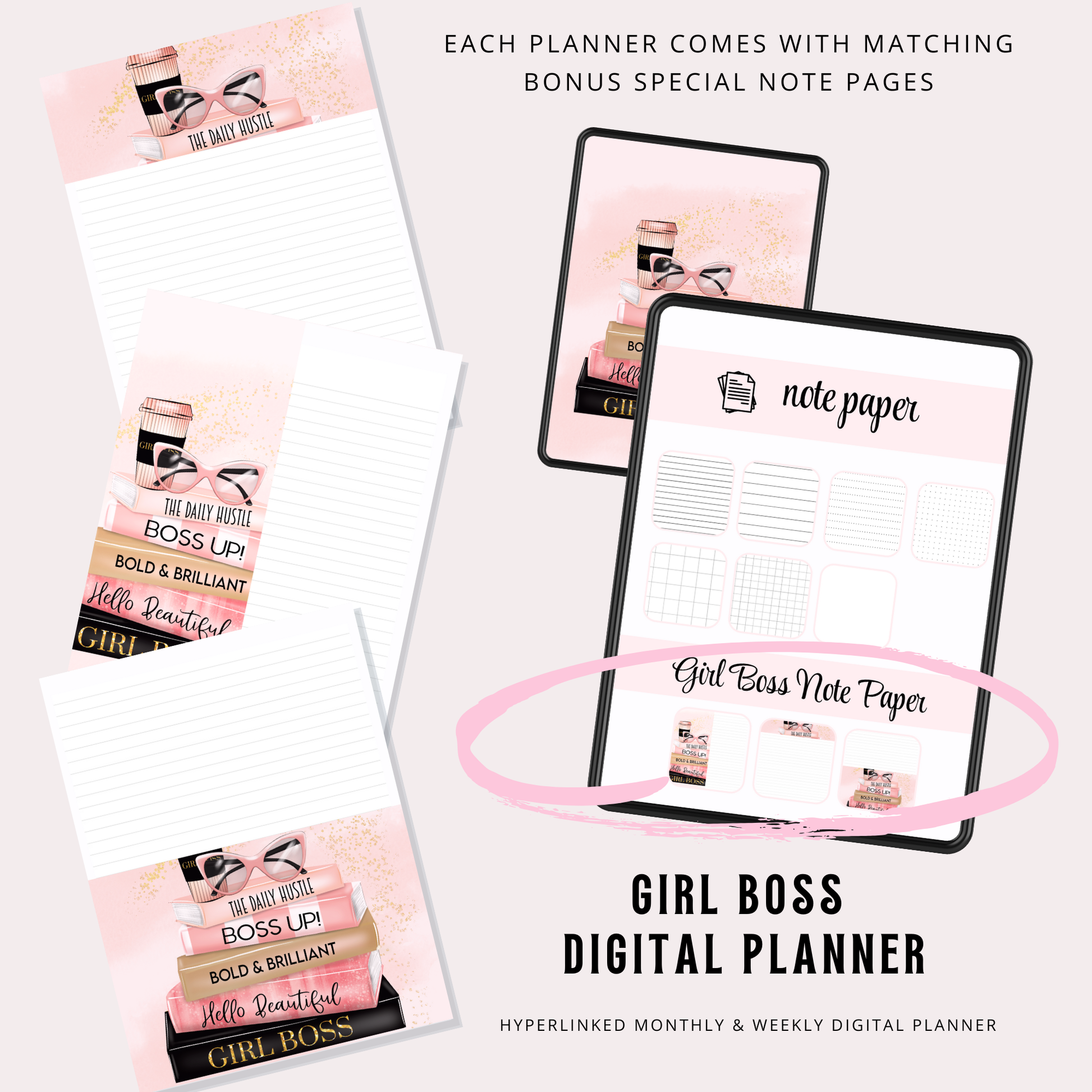 Whether you're mapping out your next big business move, tracking your self-care rituals, or just love a perfectly aesthetic layout — this Boss Babe Digital Planner has your name written all over it.