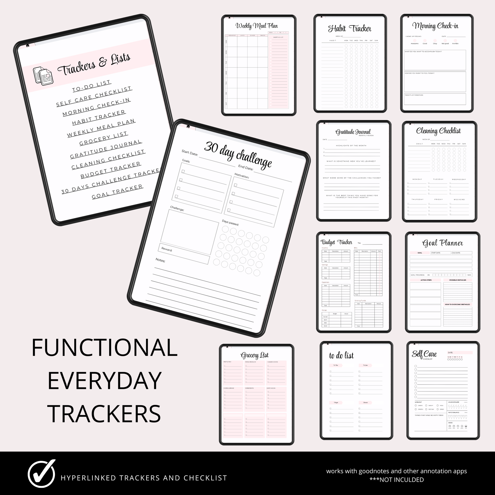 This planner is designed to be used with a PDF annotation app (such as Goodnotes or Notability) on an iPad or tablet with an Apple Pencil or stylus. We recommend using the latest operating system and most updated version of your app. Goodnotes and Notability are not included with purchase.